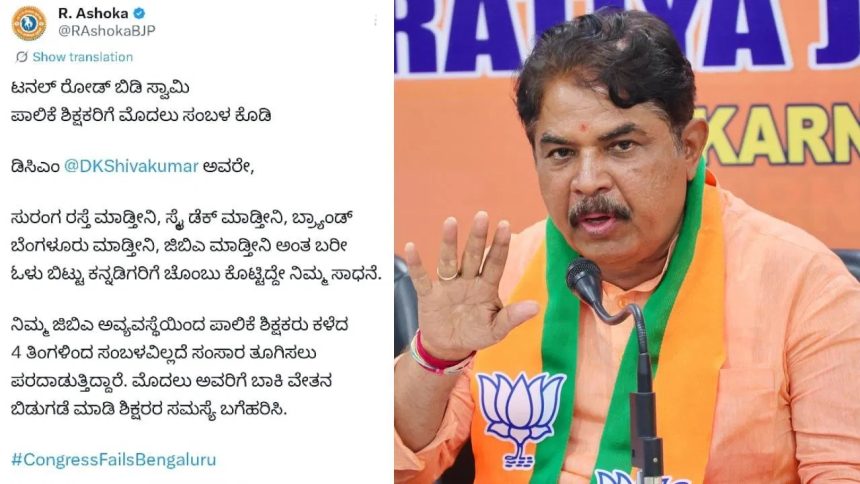 ಪಾಲಿಕೆ ಶಾಲೆಗಳಲ್ಲಿ ಮಕ್ಕಳಿಗೆ ಗುಣಮಟ್ಟದ ಶಿಕ್ಷಣ ಒದಗಿಸಲು ಅಗತ್ಯ ಶಿಕ್ಷಕರ ವ್ಯವಸ್ಥೆ ಮಾಡುತ್ತೇವೆಂದೂ, ಅತಿಥಿ ಶಿಕ್ಷಕ/ಉಪನ್ಯಾಸಕರಿಗೆ ನಿಗದಿತ ವೇತನ ನೀಡುತ್ತೇವೆಂದೂ ಡಿಸಿಎಂ ಶಿವಕುಮಾರ್ ಭರವಸೆ ನೀಡಿದ್ದರು. ಈ ಭರವಸೆಗಳು ಕಾರ್ಯರೂಪಕ್ಕೆ ಬರದ ಕಾರಣ ಟ್ವೀಟ್ ಮಾಡಿರುವ ಆರ್ ಅಶೋಕ್, ‘ಟನಲ್ ರೋಡ್ ಬಿಡಿ ಸ್ವಾಮಿ, ಪಾಲಿಕೆ ಶಿಕ್ಷಕರಿಗೆ ಮೊದಲು ಸಂಬಳ ಕೊಡಿ. ಸುರಂಗ ರಸ್ತೆ ಮಾಡುತ್ತೇನೆ, ಸ್ಕೈ ಡೆಕ್ ಮಾಡುತ್ತೇನೆ, ಬ್ರ್ಯಾಂಡ್ ಬೆಂಗಳೂರು ಮಾಡುತ್ತೇನೆ, ಜಿಬಿಎ ಮಾಡುತ್ತೇನೆ ಎಂದು ಬರೀ ಓಳು ಬಿಟ್ಟು ಕನ್ನಡಿಗರಿಗೆ ಚೊಂಬು ಕೊಟ್ಟಿದ್ದೇ ನಿಮ್ಮ ಸಾಧನೆ. ನಿಮ್ಮ ಜಿಬಿಎ ಅವ್ಯವಸ್ಥೆಯಿಂದ ಪಾಲಿಕೆ ಶಿಕ್ಷಕರು ಕಳೆದ 4 ತಿಂಗಳಿಂದ ಸಂಬಳವಿಲ್ಲದೆ ಸಂಸಾರ ತೂಗಿಸಲು ಪರದಾಡುತ್ತಿದ್ದಾರೆ. ಮೊದಲು ಅವರಿಗೆ ಬಾಕಿ ವೇತನ ಬಿಡುಗಡೆ ಮಾಡಿ ಶಿಕ್ಷಕರ ಸಮಸ್ಯೆ ಬಗೆಹರಿಸಿ.’ ಎಂದು ಡಿಕೆ ಶಿವಕುಮಾರರನ್ನು ಟ್ಯಾಗ್ ಮಾಡಿ ವ್ಯಂಗ್ಯವಾಗಿ ಬರೆದುಕೊಂಡಿದ್ದಾರೆ.
