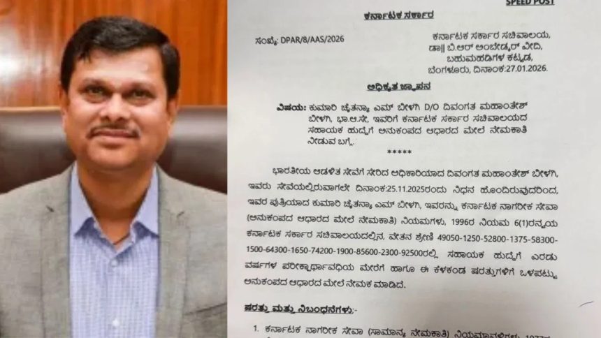 ಭಾರತೀಯ ಆಡಳಿತ ಸೇವೆಗೆ ಸೇರಿದ ಅಧಿಕಾರಿಯಾದ ದಿವಂಗತ ಮಹಾಂತೇಶ್ ಬೀಳಗಿ ಅವರು ಸೇವೆಯಲ್ಲಿರುವಾಗಲೇ 2025ರ ನವೆಂಬರ್ 25ರಂದು ನಿಧನ ಹೊಂದಿರುವುದರಿಂದ, ಇವರ ಪುತ್ರಿಯಾದ ಚೈತನ್ಯಾ ಎಮ್. ಬೀಳಗಿ, ಇವರನ್ನು ಕರ್ನಾಟಕ ನಾಗರೀಕ ಸೇವಾ (ಅನುಕಂಪದ ಆಧಾರದ ಮೇಲೆ ನೇಮಕಾತಿ) ನಿಯಮಗಳು, 1996ರ ನಿಯಮ 6(1)ರನ್ವಯ ಕರ್ನಾಟಕ ಸರ್ಕಾರ ಸಚಿವಾಲಯದಲ್ಲಿ ಸಹಾಯಕ ಹುದ್ದೆಗೆ ಎರಡು ವರ್ಷಗಳ ಪರೀಕ್ಷಾರ್ಥಾವಧಿಯ ಮೇರೆಗೆ ಹಾಗೂ ಷರತ್ತುಗಳಿಗೆ ಒಳಪಟ್ಟು ಅನುಕಂಪದ ಆಧಾರದ ಮೇಲೆ ನೇಮಕ ಮಾಡಲಾಗಿರೋದಾಗಿ ತಿಳಿಸಲಾಗಿದೆ. 15 ದಿನಗಳ ಒಳಗೆ ಕೆಲಸಕ್ಕೆ ಹಾಜರಾಗುವಂತೆಯೂ ಸೂಚಿಸಲಾಗಿದೆ.